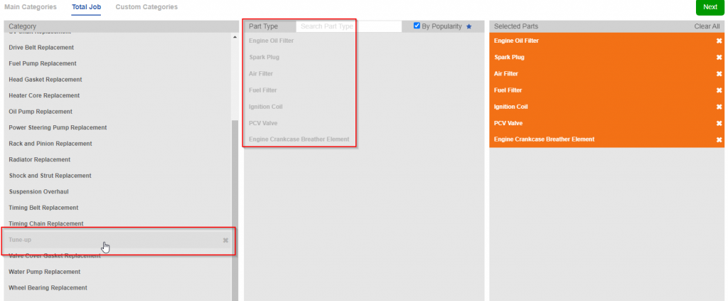 After clicking ‘Total Job’, select the job you are looking for, and you will see the recommended Part Types selected to the right