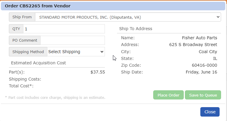 Select your “Ship From” location, ‘Shipping Method’, and then choose Place Order or ‘Save to Queue’.
