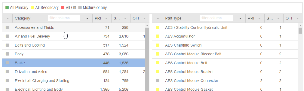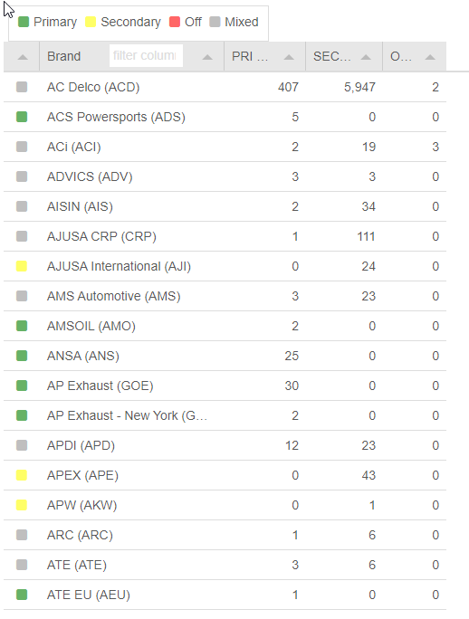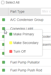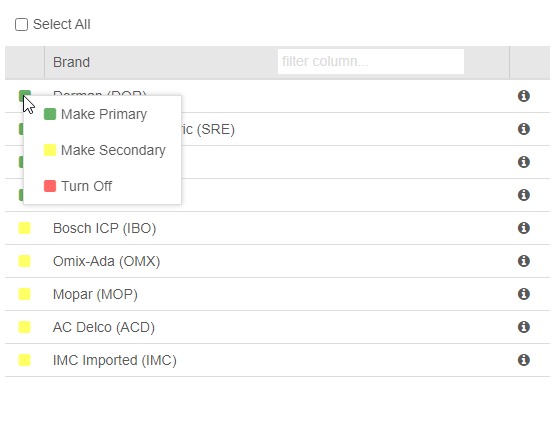 In the 3rd column, you can now set Brands as Primary, Secondary, or Off for that given part type.