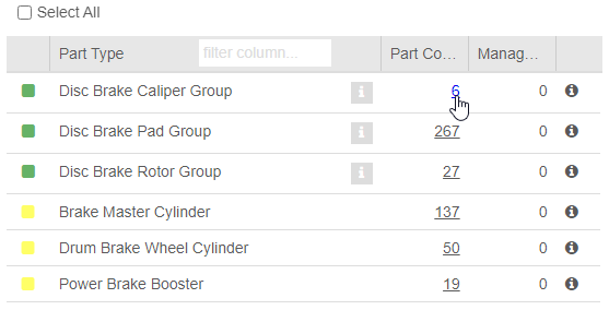 When working in the Brand Workflow, you can drill down to the Part Type level, and then click your Part Count to manage Part Visibility as well as Notes.