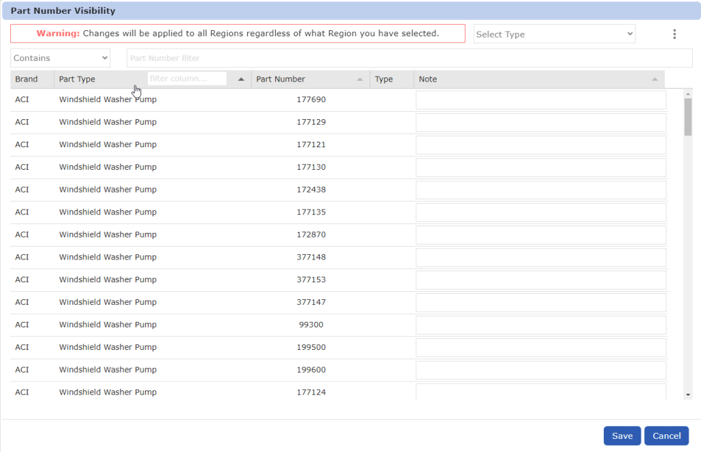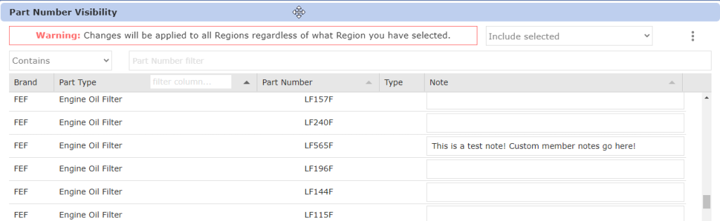 You are presented with a window that allows you to Include or Exclude selected parts within a Part Type, and also add Notes at a Part Number level that are viewable to your customers during lookups. Simply filter down to your desired parts using the ‘Contains’, ‘Begins with’, or ‘Ends with’ options, or the Part Number filter along the top, then select a workflow ‘Include’ or ‘Exclude’ from the top right corner.
